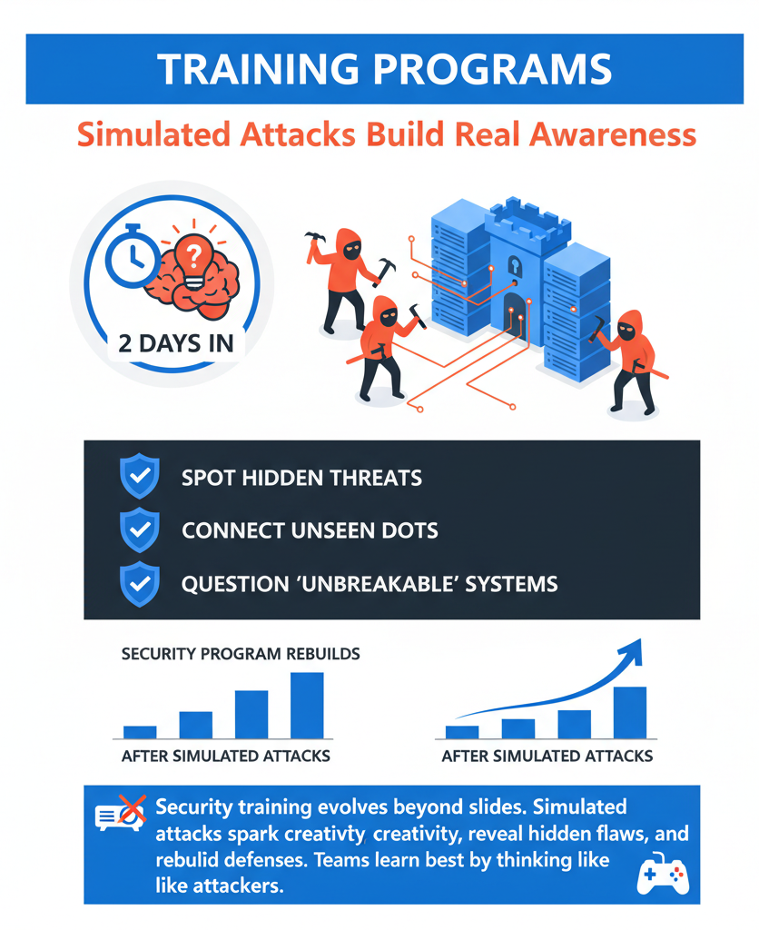 Security training used to mean death by PowerPoint. Not anymore. Our red team exercises go beyond slideshows, a security mindset training program forces teams to break into their own systems and learn the hard lessons attackers already know. Want to see a security team wake up? Tell them to break into their own network.