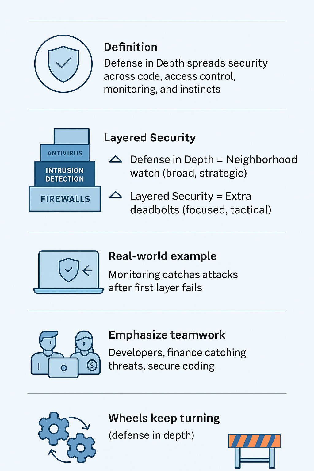• Think of layered security as one chapter in defense in depth’s bigger story – it’s the tech stuff, while defense in depth covers the whole security picture