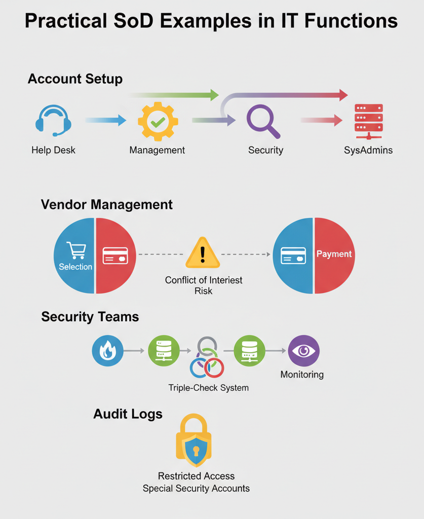 Separation of duties and segregation of duties prevent one person from holding too much power in IT security controls. By dividing user access management tasks and applying the least privilege principle, organizations reduce mistakes and block fraud prevention IT risks. These checks create internal control mechanisms that protect data and improve accountability.