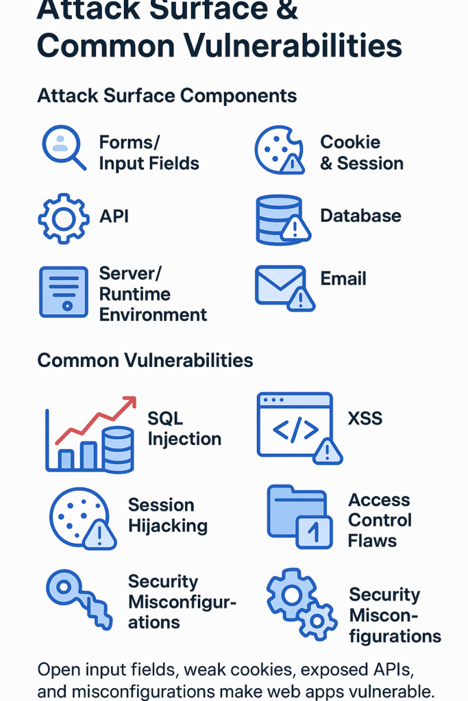 The web application attack surface is the total set of entry points an attacker could try. These include APIs, user interface security gaps, authentication entry points, and admin interfaces. Attack vectors like injection attacks, cross-site scripting, or broken access control take advantage of these weak spots. When security misconfigurations or data exposure exist, the attack surface grows. Entry points can be internal-facing interfaces, external-facing interfaces, or even search functions and data entry forms. Knowing how vulnerabilities connect with attack vectors is key to reducing risk and managing overall security.