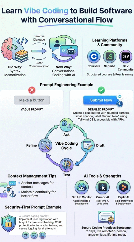 Learning vibe coding with a security-first mindset is less about finding one perfect tool and more about building habits that fit how you think and work. Clear structure helps turn ideas into precise instructions and avoid fragile results. For those exploring where to learn effective vibe coding techniques, this foundation sets realistic expectations. As skills grow through iteration and hands-on practice, confidence follows. If you’re ready to go deeper, the secure coding practices bootcamp offers practical training for real-world application.